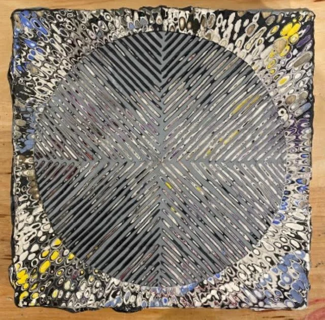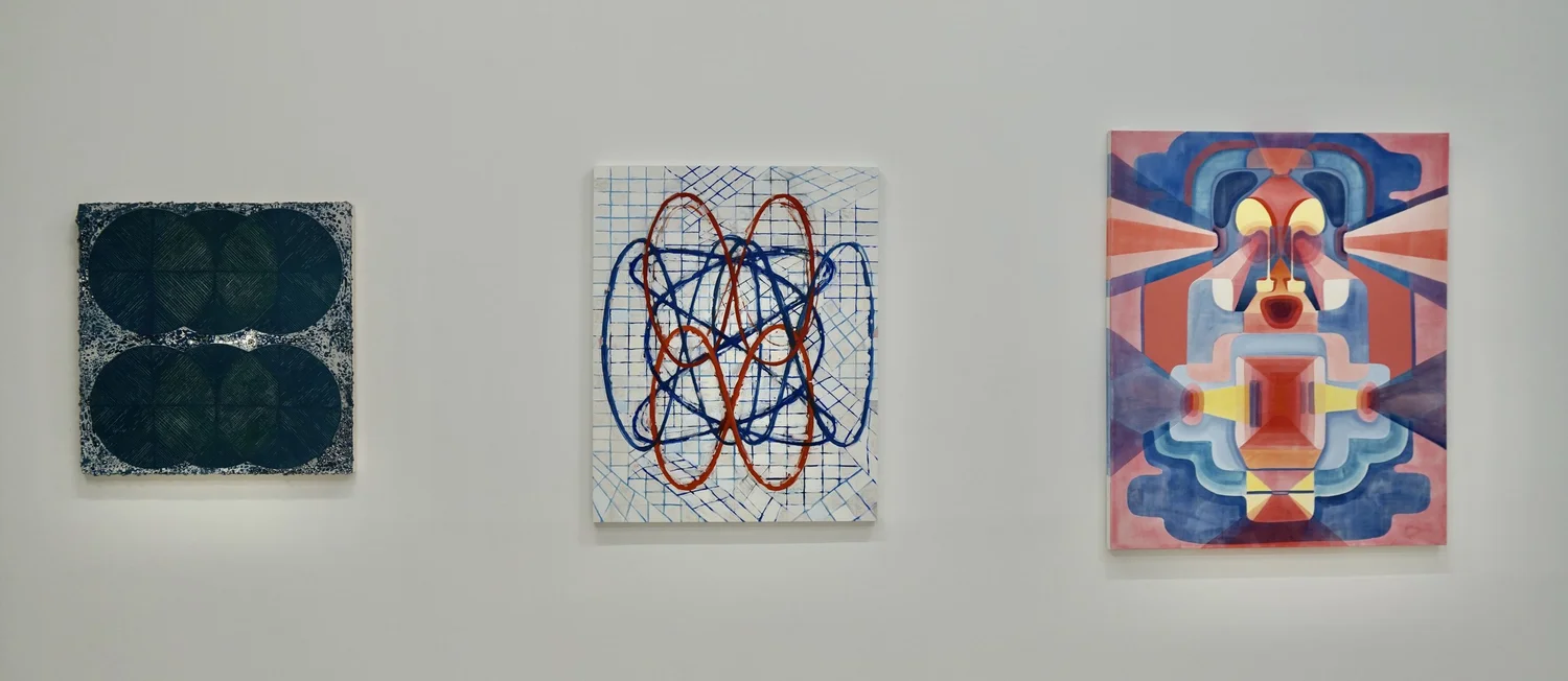 Lauren Comito works from flattening packaging material until it forms a pleasing form that she can expand upon in her works on paper and paintings. Finding usable shapes in the flattened material is only the beginning, from there - she turns these forms into otherworldly forms that reference alien life, the human body and psychedelic poster art from the 1960’s and 70’s. Her connection with the grid is paramount: eye balls, body parts, mouths, faces all fall within highly symmetrically conceived compositions. Amongst these forms, multiple portal shapes that are centrally located throughout her paintings beckon the viewer closer. Reflecting on her paintings and drawings, Comito says, “in my work the grid is a matrix from which to build. I explore the geometric relationships between shapes derived from everyday items to create blueprints for new structures. The paintings are abstract and suggestive, which creates an openness and slippage of perception.”