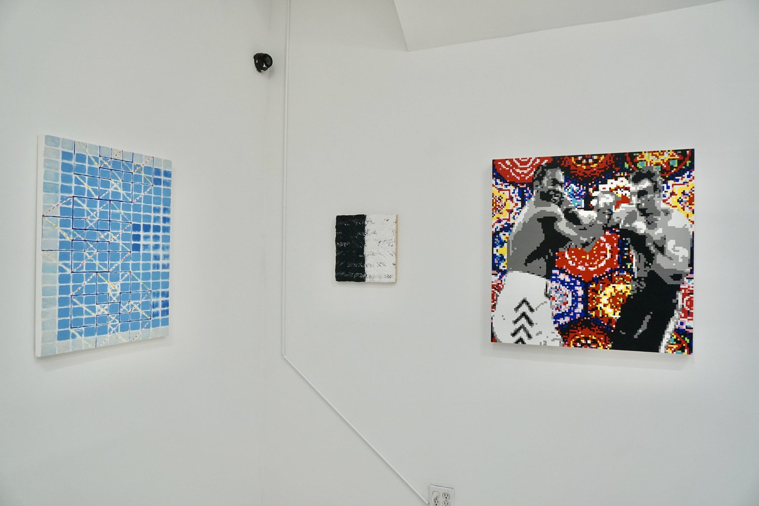 Robert Otto Epstein masterfully blends 8 bit 1980’s Nintendo graphic design, American sports, and intricately built up figurative and abstract forms from only quarter inch sized blocks of color. Epstein paints line by line on panel, consistently referencing the grid and the outer perimeter of his compositions with every block added. Epstein’s focused painting technique continuously reverses the hierarchy of his figure and background relationships, the viewer is repeatedly asked to consider both subject choices as equals. The contrast of power and restraint are visible for all to see in this artist’s work.